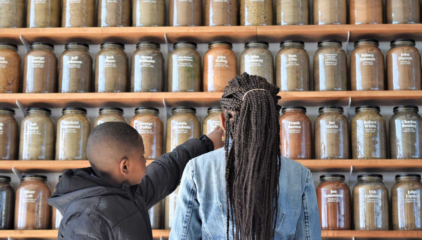 It’s actually two walls — there are two sides of it, running the entire length of the room. There’s 800 jars in total. Clean glass, pristine lids, neatly arranged in impeccable order. Each filled with soil collected at the site of lynchings. Each representing one human dying in front of a crowd, dangling helplessly from a noose.